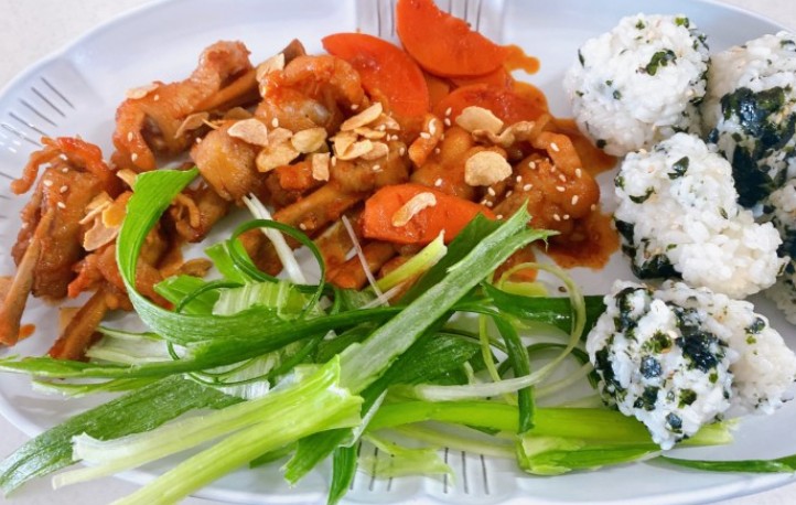우리식구들 좋아하는 닭발을 고추장, 물엿, 연두 반스푼 , 넣어 양념 만든다음에 파마늘 및 각종 야채를 채썰어 준비해준후 한번 삶아낸 자숙 닭발에 양념물 넣어 조리면 집에서도 혼술 메뉴 완성 이에요 주먹밥까지 야무지게 만들엇어요 ㅎ