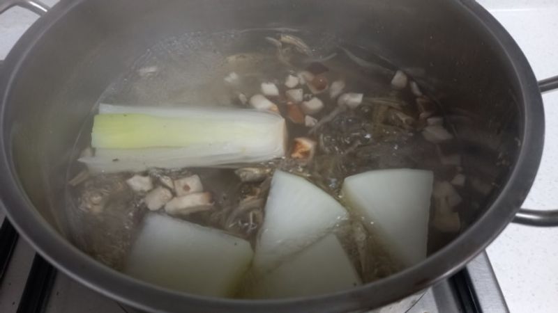 멸치, 표고버섯, 무,, 대파로 육수를 내고 거른다음