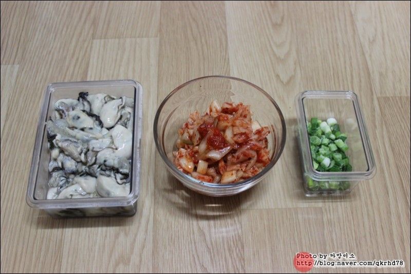 제철굴 한접시에 잘 익은 묵은배추김치,밥 한공기, 송송 썰어낸 쪽파.한접시..