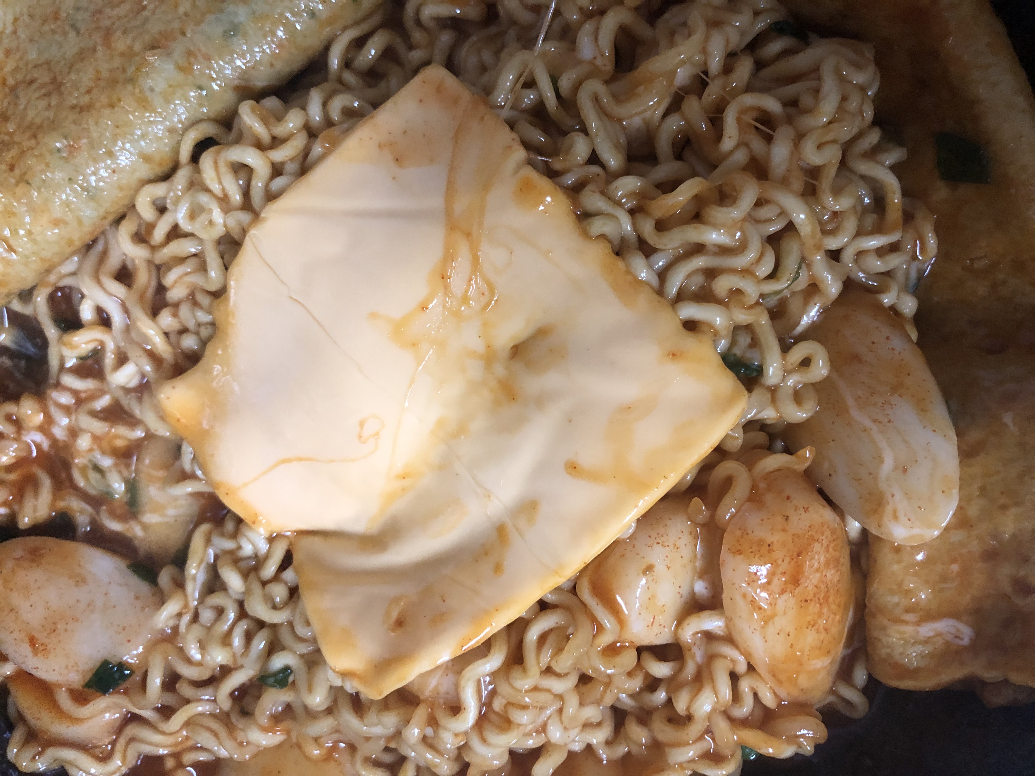 어느 정도 익으면 피자치즈와 네모치즈 파를 넣어요.