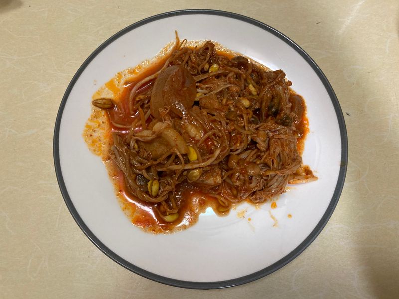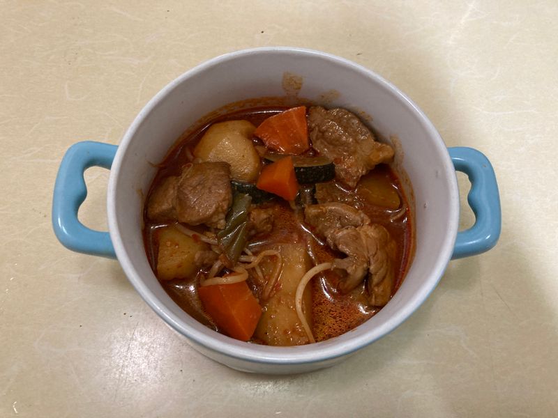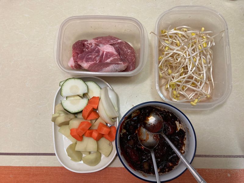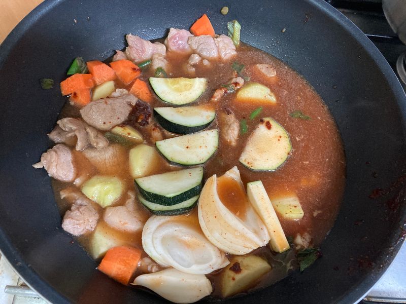 그리고 남은 목살로는 또 콩나물 제육볶음과 감자, 당근, 쥬키니, 양파 등의 야채가 들어간 목살짜글이도 만들어 먹었어요!