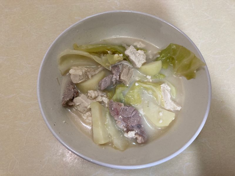 목살수프는 건더기로는 목살에 양배추, 감자, 두부가 들어가고 사골수프와 치킨스톡으로 간을 한 국물이랑 잘 어울렸어요.