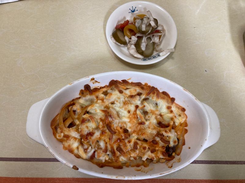 스파게티도 가끔 생각나서 스파게티 소스에 안심 썰어서 고기를 추가하거나 해서 만든 피클이랑 맛있게 먹었습니다. 모짜렐라 치즈 올려서 오븐에 익히면 더 맛있습니다!!