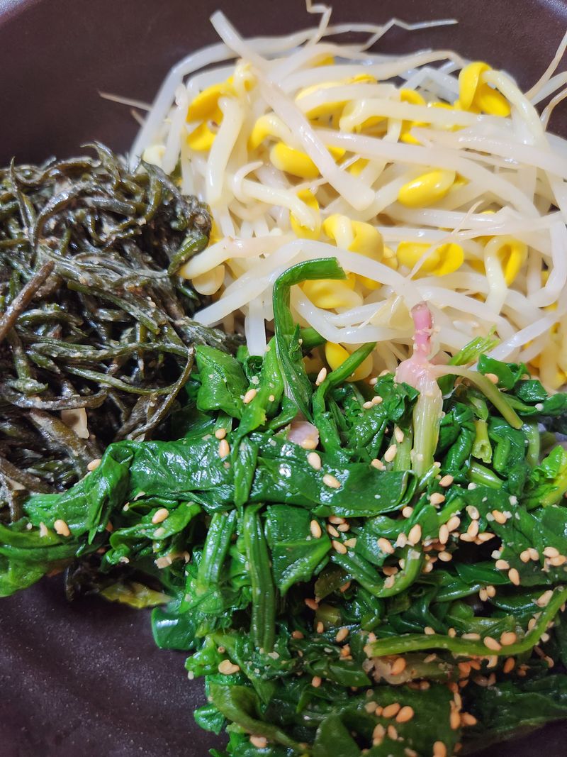 시금치, 콩나물, 톳나물까지 봄에는 나물이 많아서 좋아요.