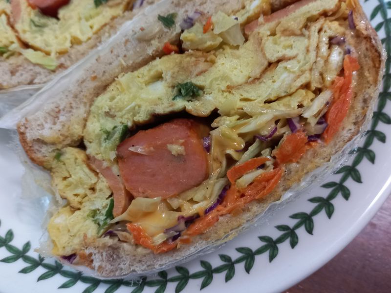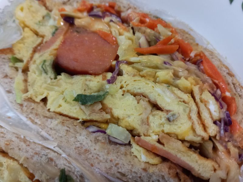 겨울에 금값이던 야채값이 많이 싸졌어요~ 양배추 커다란거 한통에 당근한봉다리 사서 계란야채전만들고 또 당근 볶구 야채믹스도 가득넣어서 소세지 굽굽! 야채가득 계란전샌드위치만들었어요~~