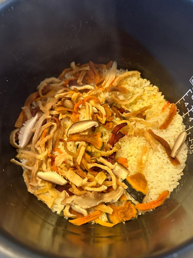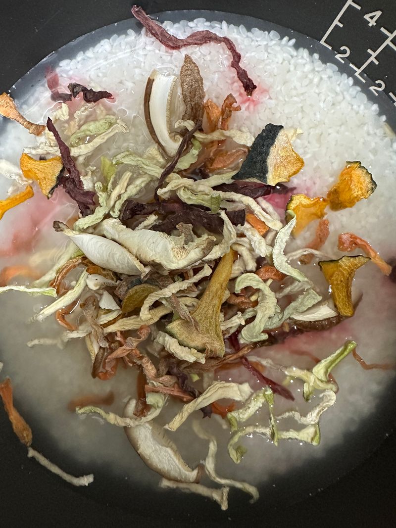 지난 가을에 당근, 비트 ,버섯, 단호박, 애호박을 건조시킨 건채소를 얻게 됐어요. 깨끗하게 손질하여 말린 것들이라 쌀을 씻어서 바로 넣어 밥을 했지요. 바쁜 출근길에 아침식사로 준비하기에 딱이었답니다. ㅎㅎㅎ 양념간장만 준비하면 든든한 한끼!! 꿀맛이네요!! 봄은 식탁으로 먼저 오는데.. 전 오늘 묵은 나물로 지난 가을을 만났습니다. ㅎㅎㅎ