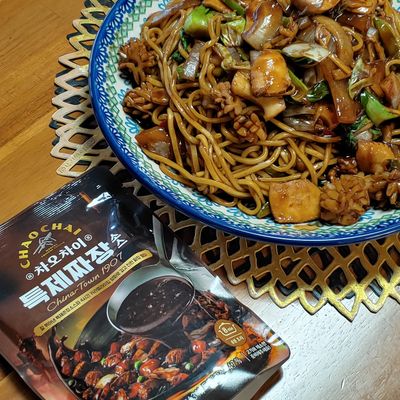 좋아하는 채소와 훈제오리 볶아 밥 위에 톡!