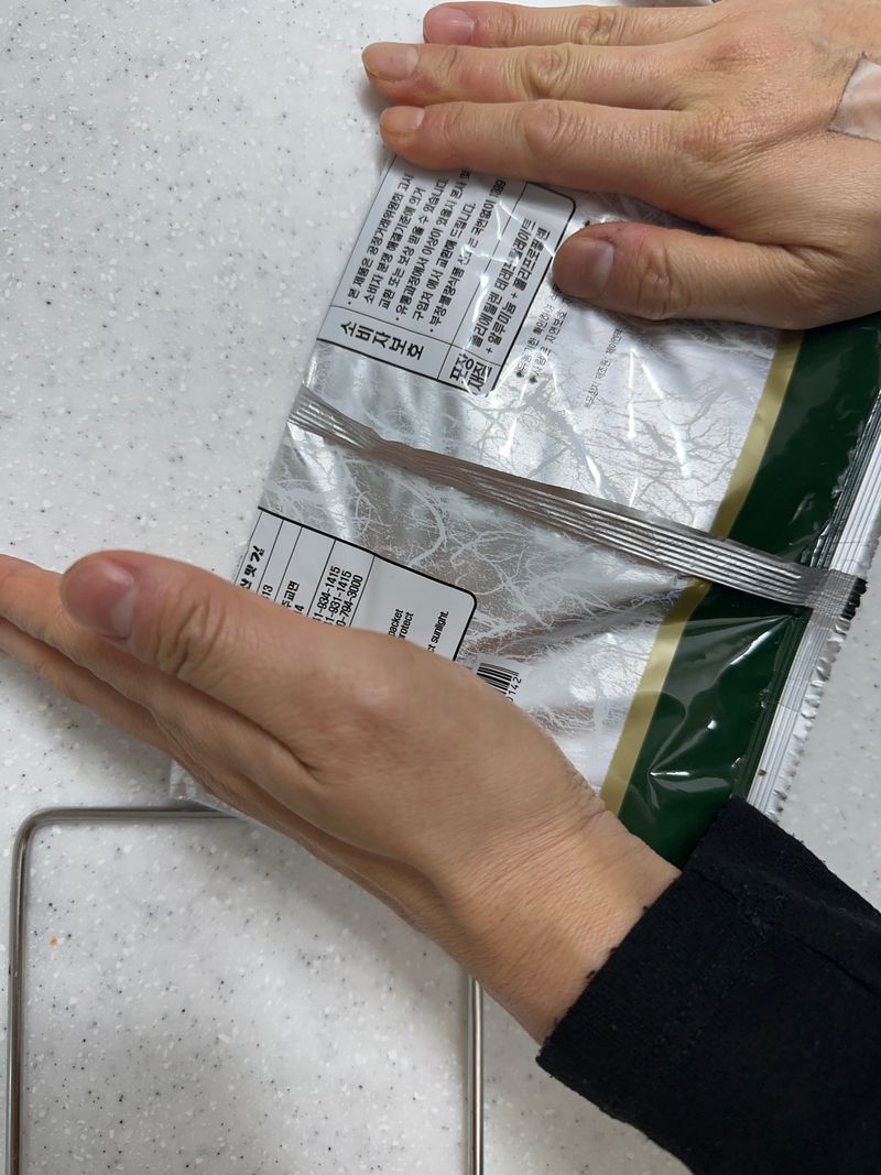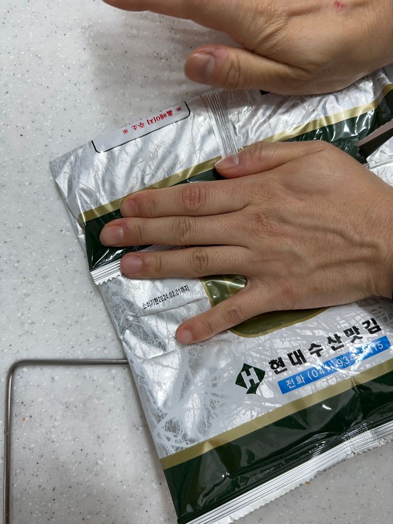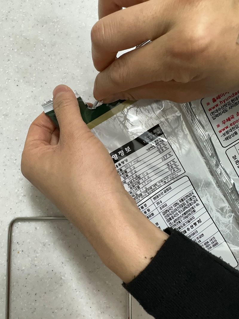 가위를 사용하지 않고 살짝 바람빠지게 봉지를 연 후에 손 날을 이용해 쓱쓱 문지르면 바로 김이 잘립니다