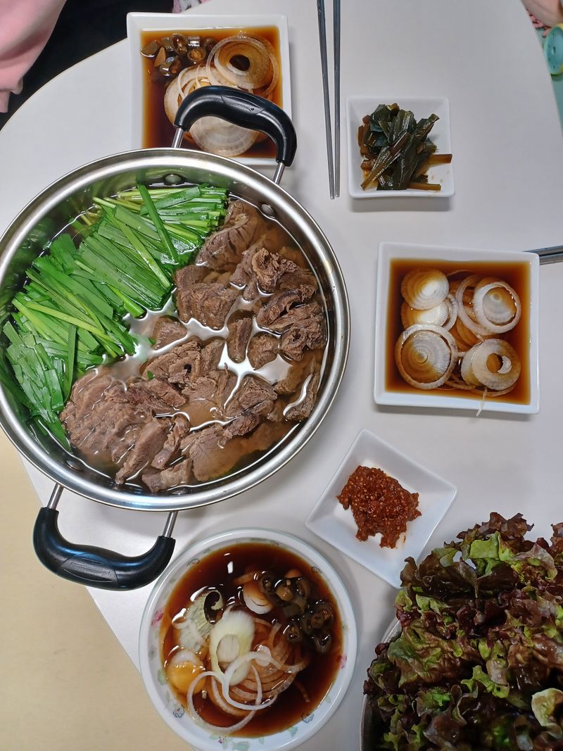 아내와 아이가 감기에 걸렸어요. 오늘은 비도 오는 토요일이라 빨리 감기를 이겨내라는 의미로 한우1등급 아롱사태로 뜨끈하게 수육전골을 만들었답니다. 몸에 좋은 부추도 듬뿍 넣었네요. 부드러운 고기에 단짠 간장 소스가 잘 어울렸어요. 가족 모두 맛있게 먹어줘서 고마웠답니다^^
