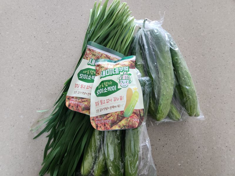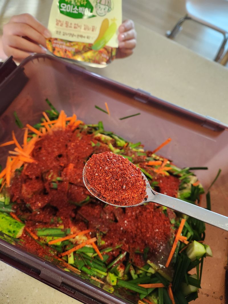 오이10개 ,부추반단,고추가루 14스푼,새미네부엌오이소박이 양념2개