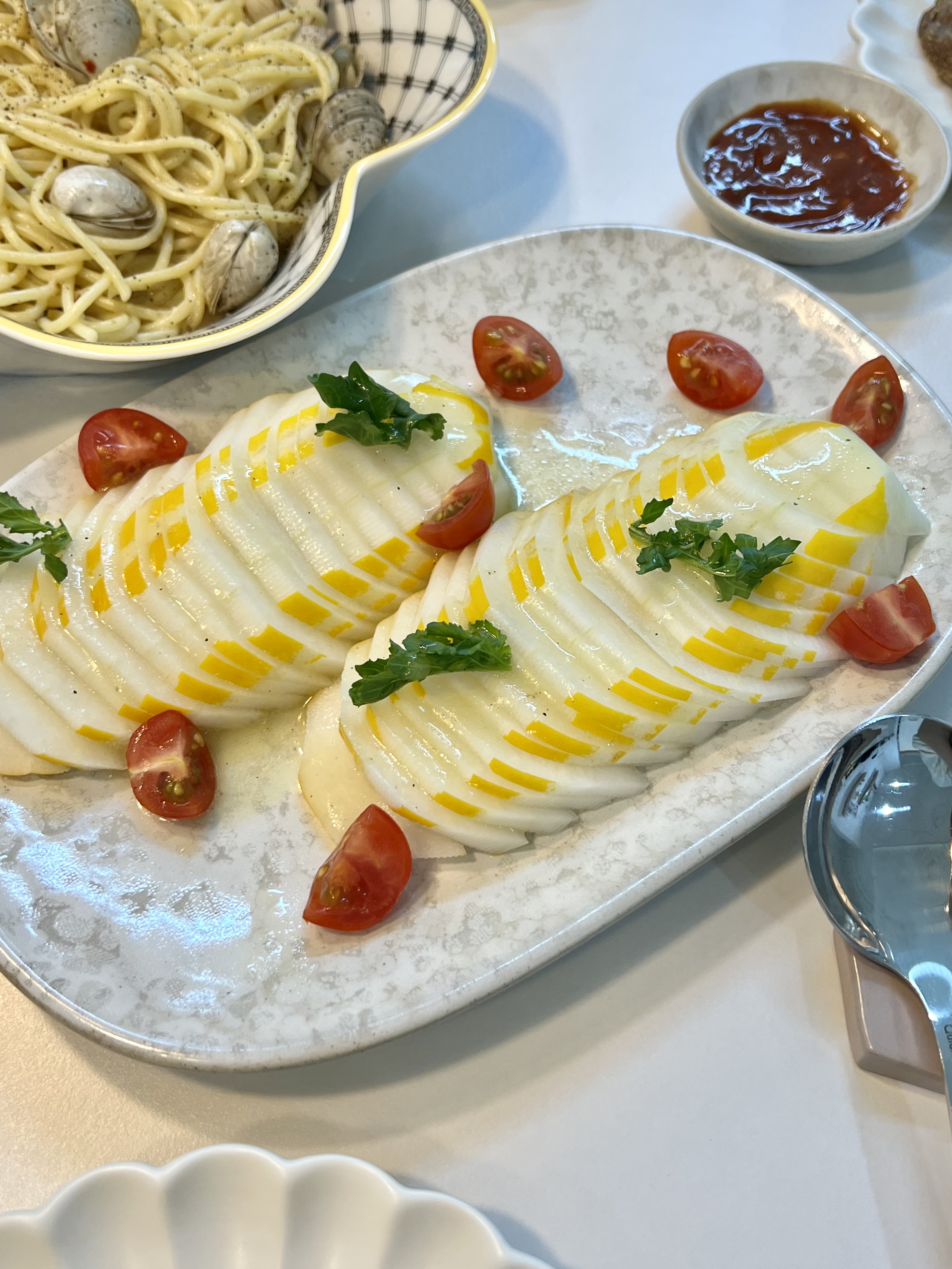 최근에 출산한 친구를 집에 초대해서 맛있는 한 끼 대접했습니다💙 최신 유행하는 참외샐러드, 누름 감자 갓 구운 루꼴라피자, 동죽파스타까쥐! 친구가 맛있게 먹어줘서 넘넘 기뻤어요😍