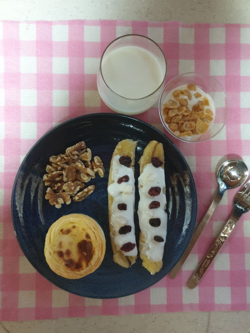바나에 요거트 뿌리고 견과류에 씨리얼과 함께 주말 브런치 만들어 주었어요