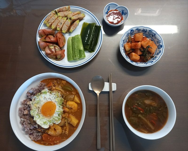 계란 후라이까지 올리니 풍성해졌어요