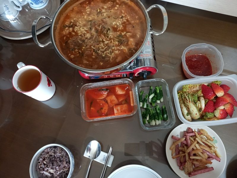 겉저리 싱싱하게 묻혀서 먹는 라면~ 주말 한끼식사로 맛있어요. 파도 돌돌말아 초고추장 찎어먹으면 맛있어요.