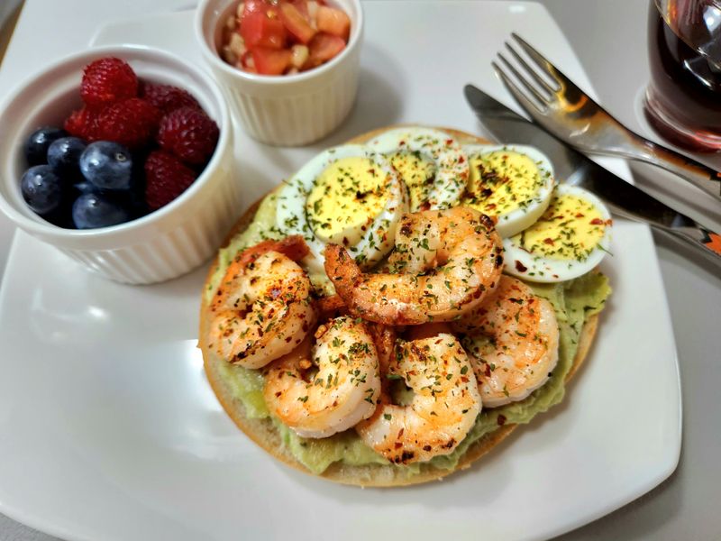 샐러드먹을때 넣는다고 구매한 냉동아보카도 다이스...ㅡ.ㅡ 너무 해동되니 물러지더라구요. 그래서 아보카도를 으깨서 과카몰리로 만들었습니다! 베이글 반 잘라서 살짝 구워주고. 과카몰리바르고, 구운새우와 삶은계란으로 반반 토핑해줬어요^^ 한접시에 샌드위치 놓고 과일 조금씩 놓고하니 나름 근사한 홈브런치가 완성되었네요^^