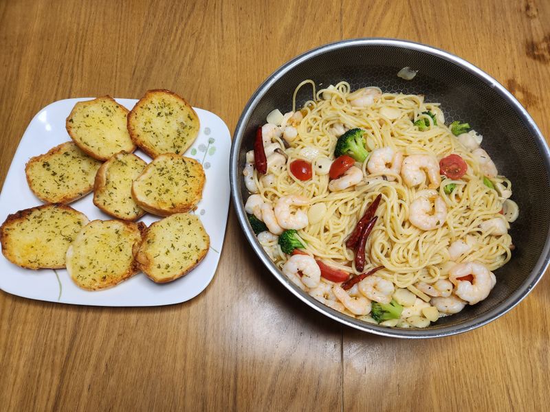 특별한 날 새우 파스타를 준비했어요! 마늘바게트와 알리오올리오 새우파스타 플레이팅을 위해 알록달록 색감을 사용했어요^^