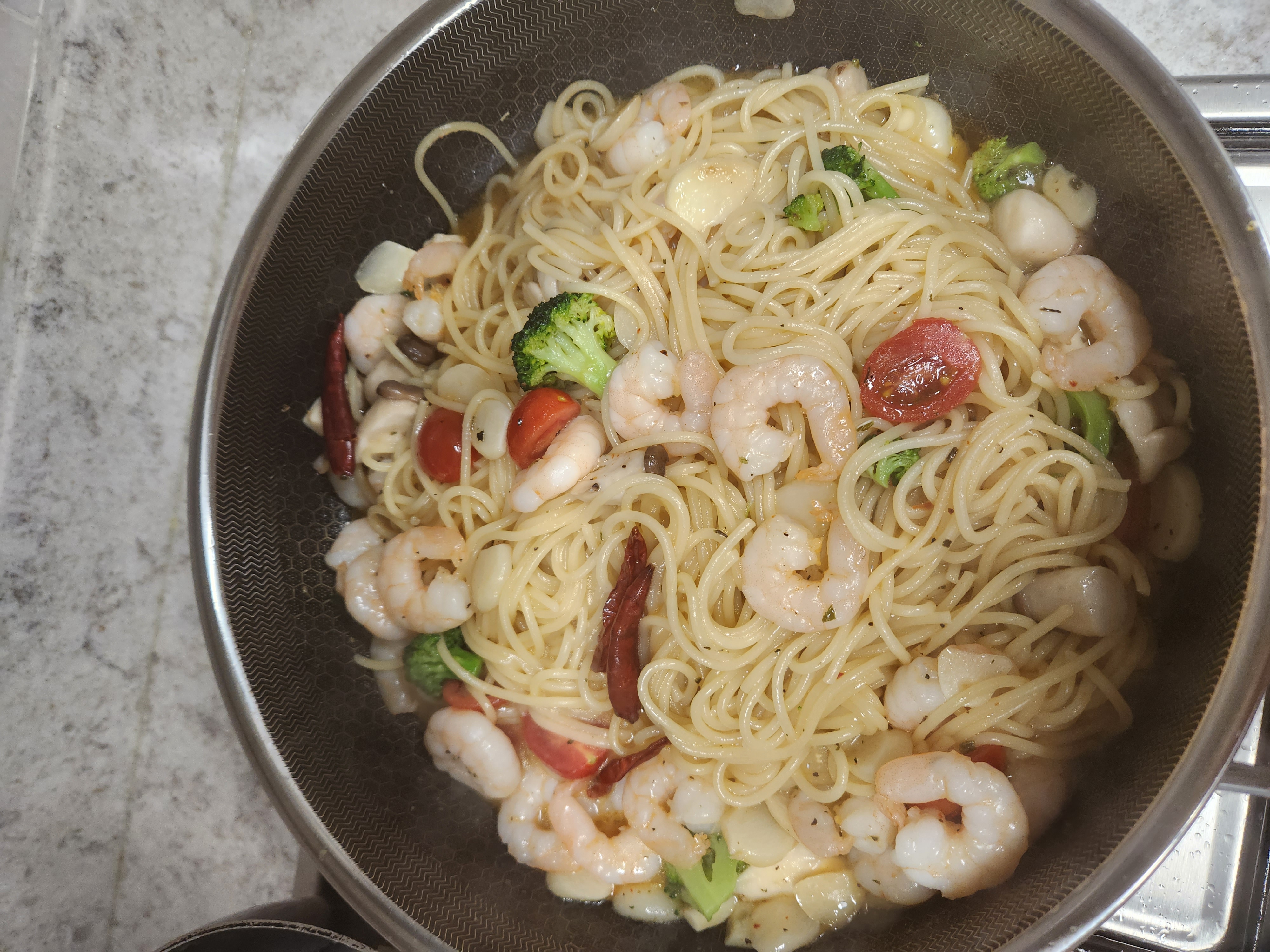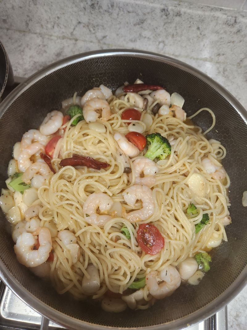 알리오올리오에 토마토랑 브로콜리를 넣으니 색감이 알록달록 먹음직스럽네요!