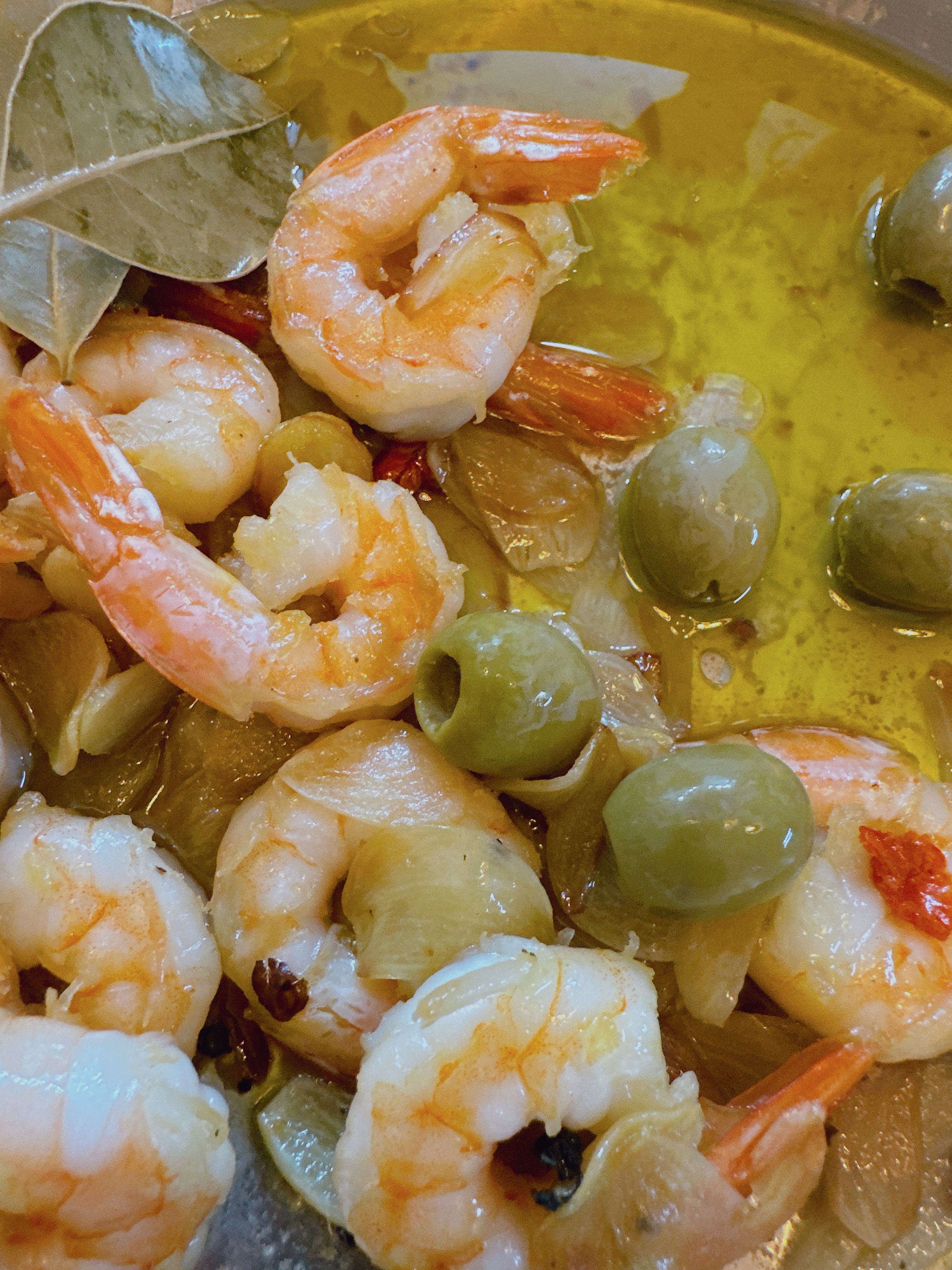 감바스!!! 새우도 듬뿍, 거기에 올리브까지 넣은게 엄청 맛있어보여요~ㅎㅎ 저 잎은 월계수잎인가요.....? (집에 월계수잎도 있으시다니!!)