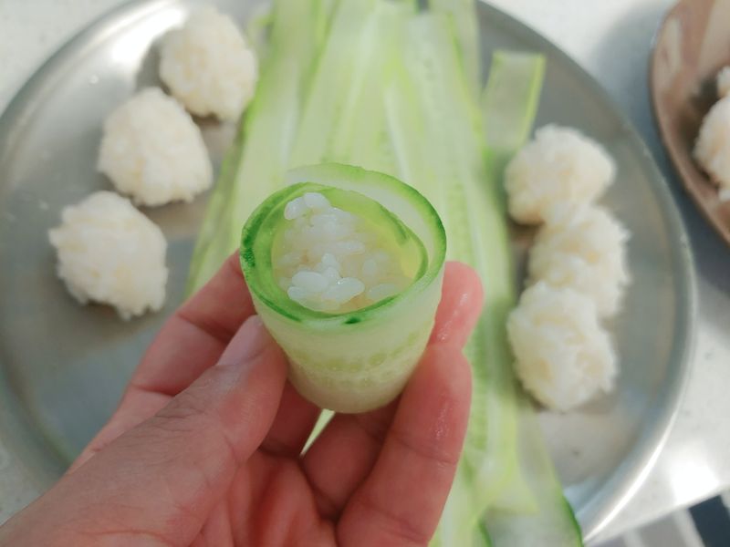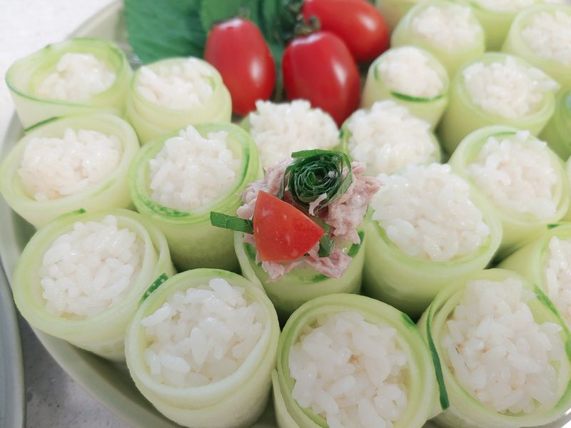 불이 필요없는 오이롤이에요! 감자칼을 이용해 오이를 길게 깎아준 뒤, 초밥 간을 한 밥과 참치나 연어, 날치알등 먹고 싶은 재료를 얹어주면 끝~^^