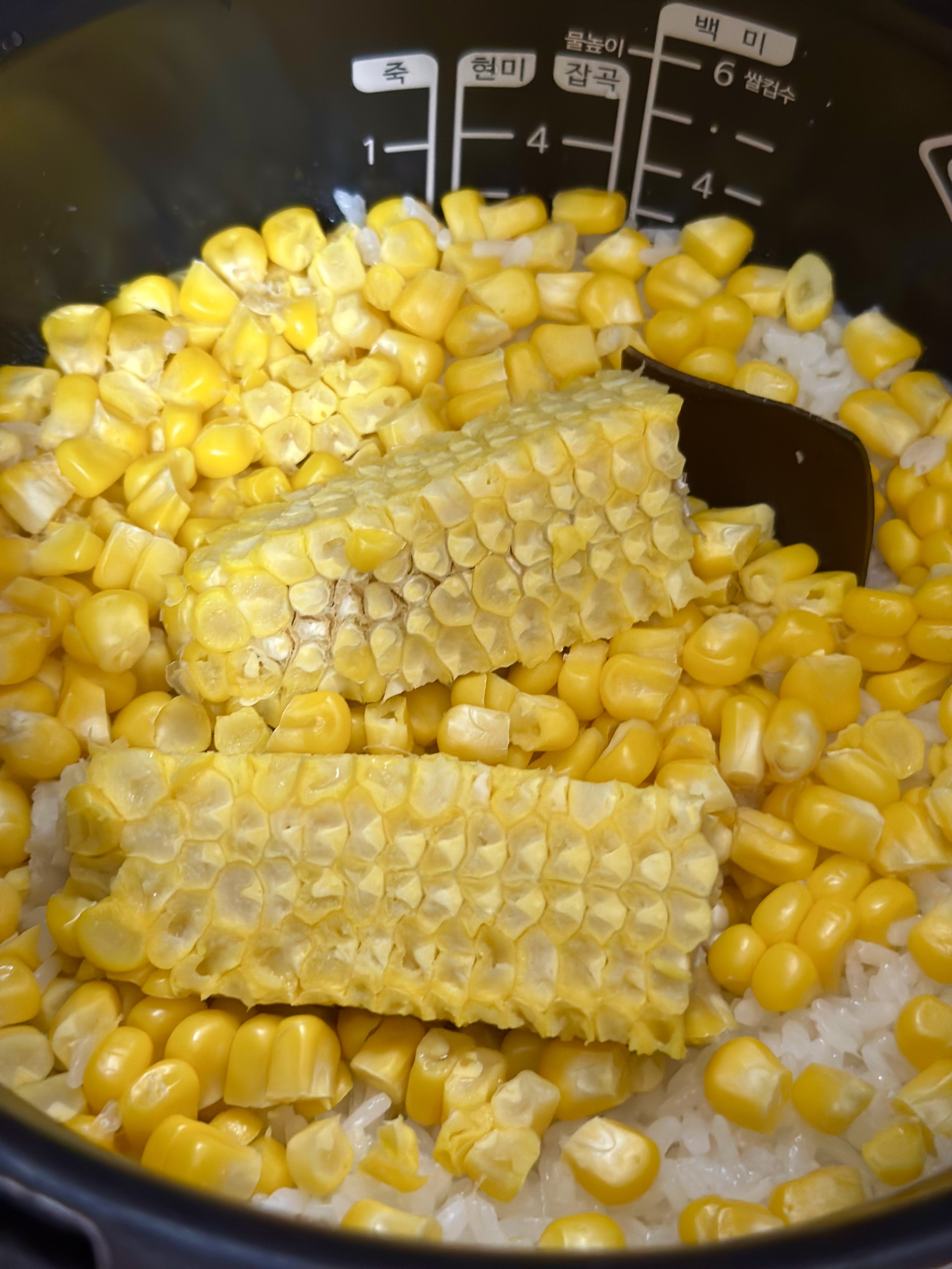 1)쌀 두 컵에 초당옥수수 하나를 넣고 밥을 합니다
