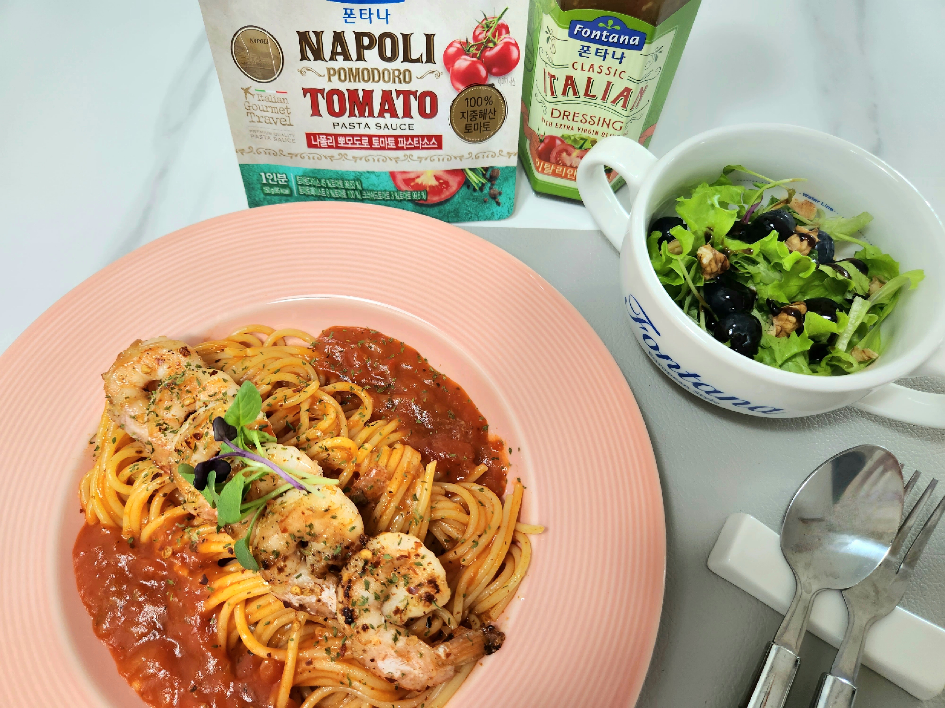 오늘점심은 근사하게♡ 혼자 먹지만 이쁘게 차려서 먹었어요^^/ 토핑으로 올릴 새우는 따로. 다진마늘.버터.올리브유.액젓 조금.해서 만들어놓고~ 이번에 이벤트당첨으로 선물받은♡ 토마토파스타소스로 휘리릭~ 금방 파스타한접시가 완성됩니다~^^