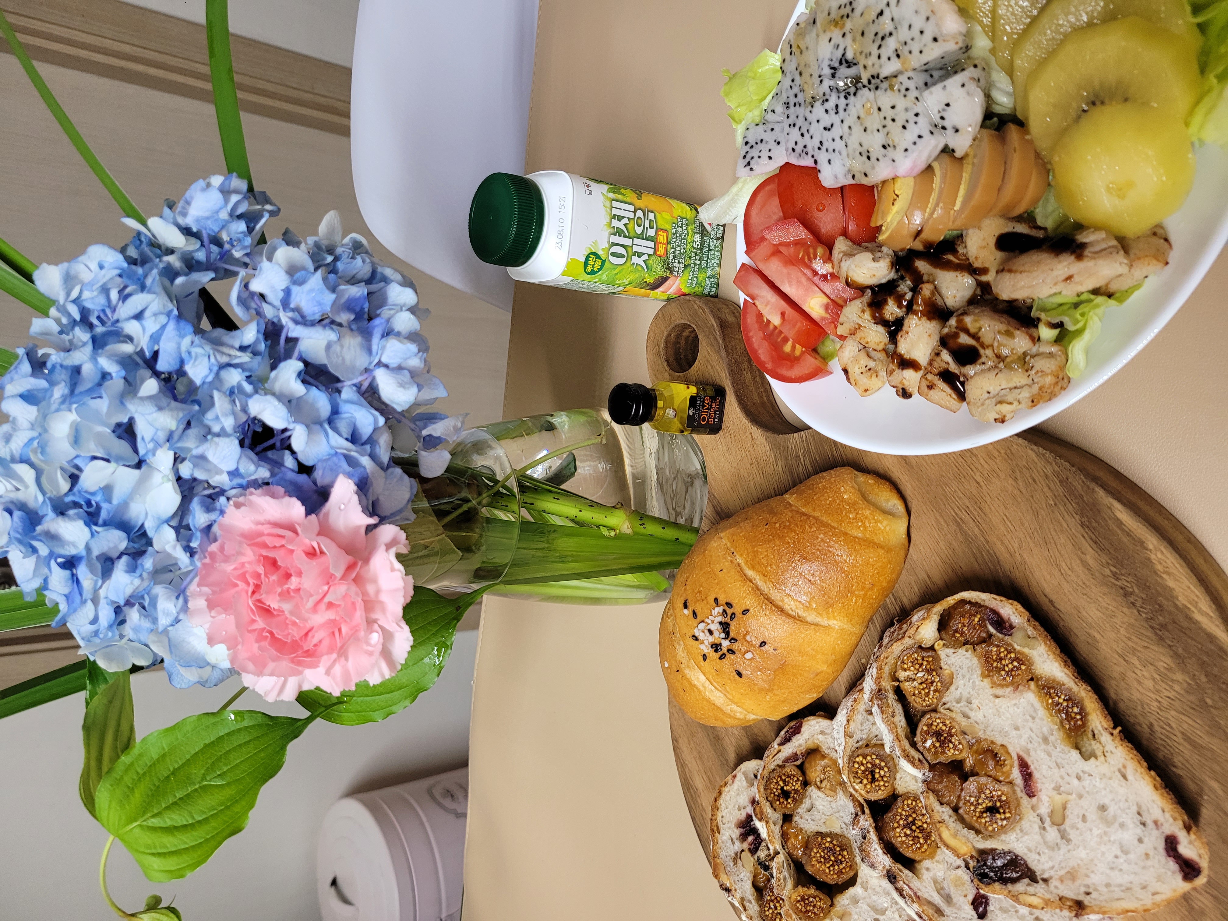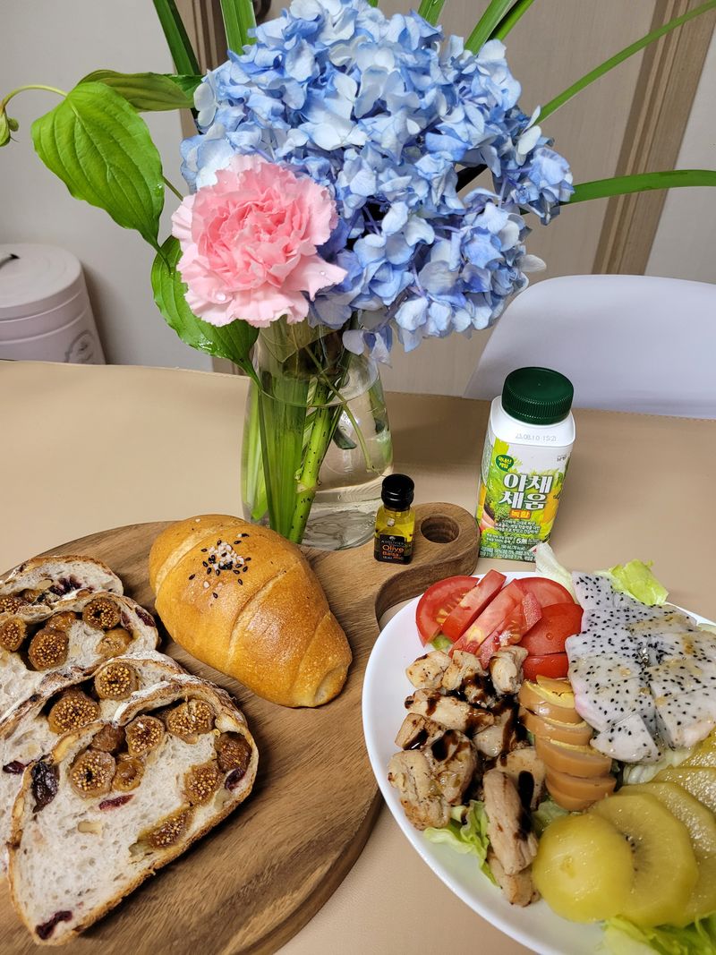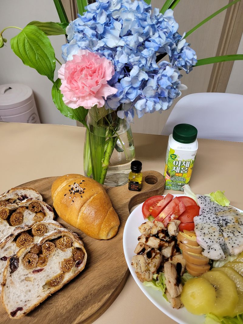 식탁에 수국 이뻐요^^ 샐러드,빵 맛있어보여요