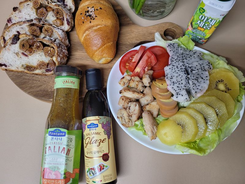오늘 저녁은 샐러드와 빵먹었어요.