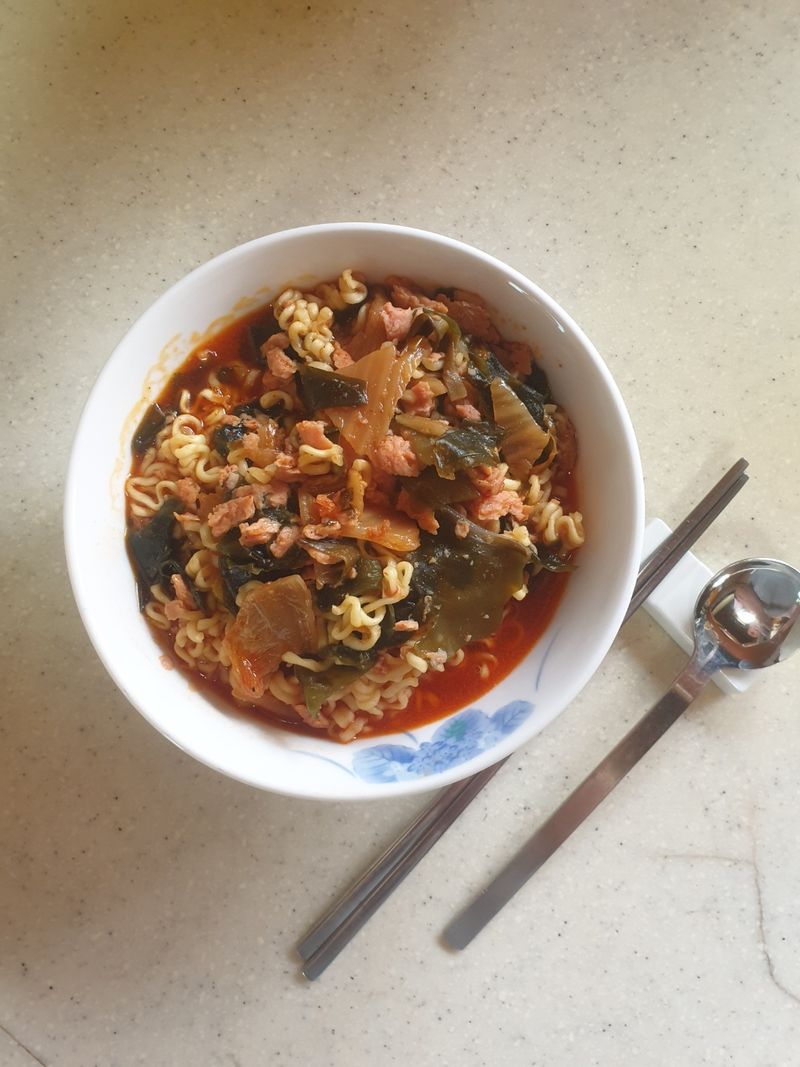 미역, 김치 는 필수 !! 그외는 좋아하는 재료. 미역이 들어가서 포만감 있고, 다음달 식이섬유 풍부해서 화장실 잘 다녀올수 있어요. 휴가지 요리로 딱이예요.