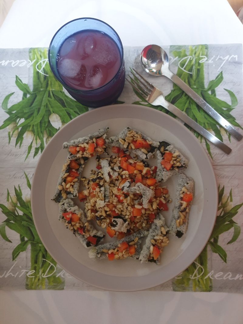 김부각위에 현미밥에 상큼하게 조린 토마토, 당근 올려서 핑거부드로 먹으면 더운 여름 기분 상쾌해져요.