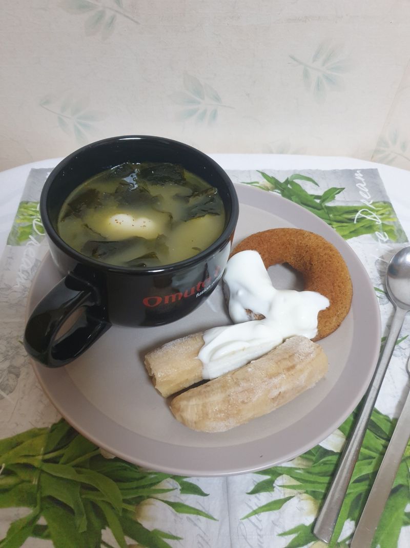 조랭이떡 넣은 미역국에 냉동바나나위에 요거트, 빵한조각.