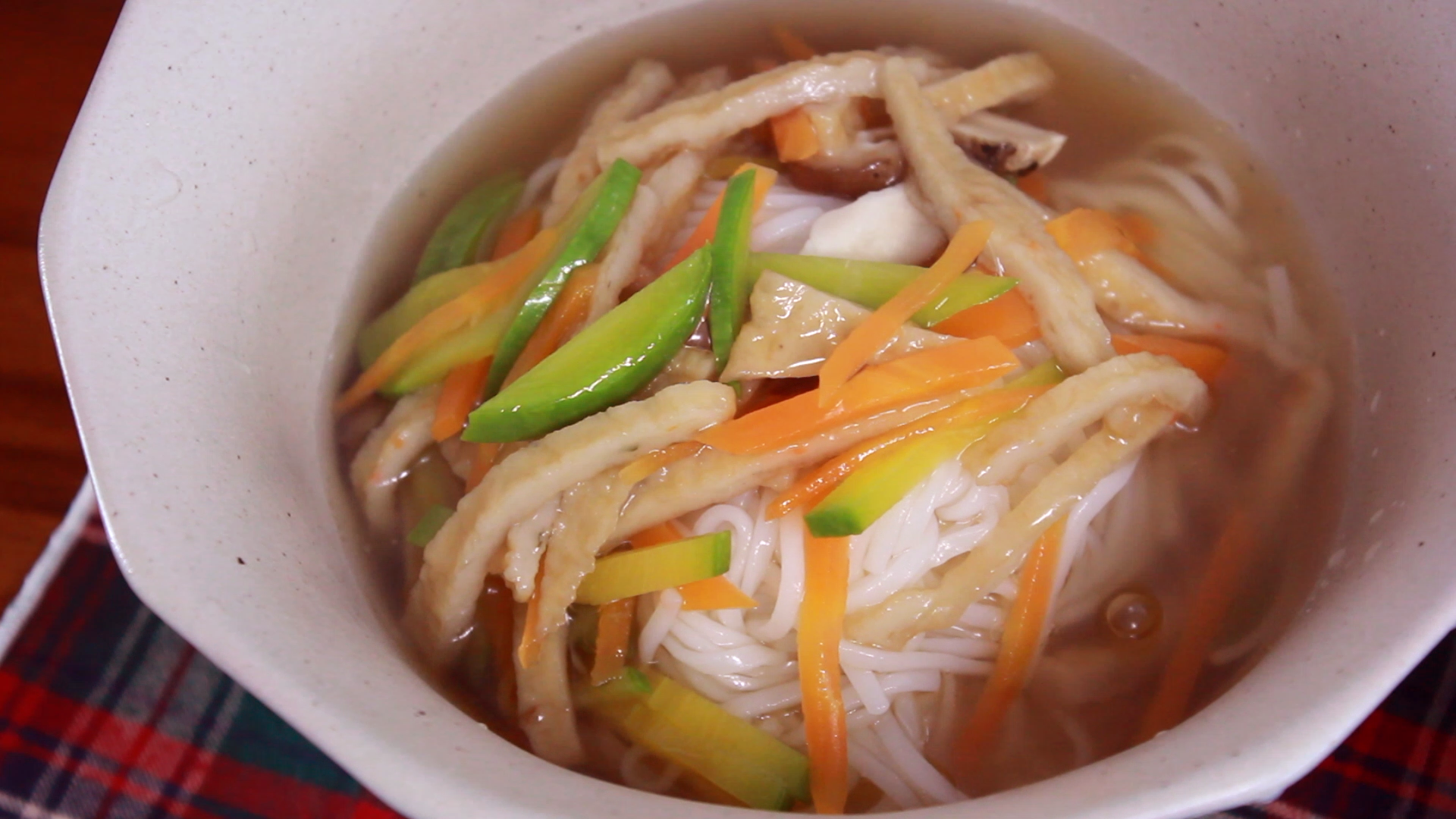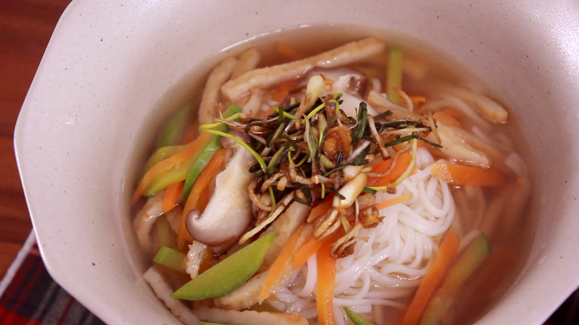 채소육수에 어묵, 당근, 애호박, 버섯을 넣어 끓여주고 삶은 국수위에 넣어주면