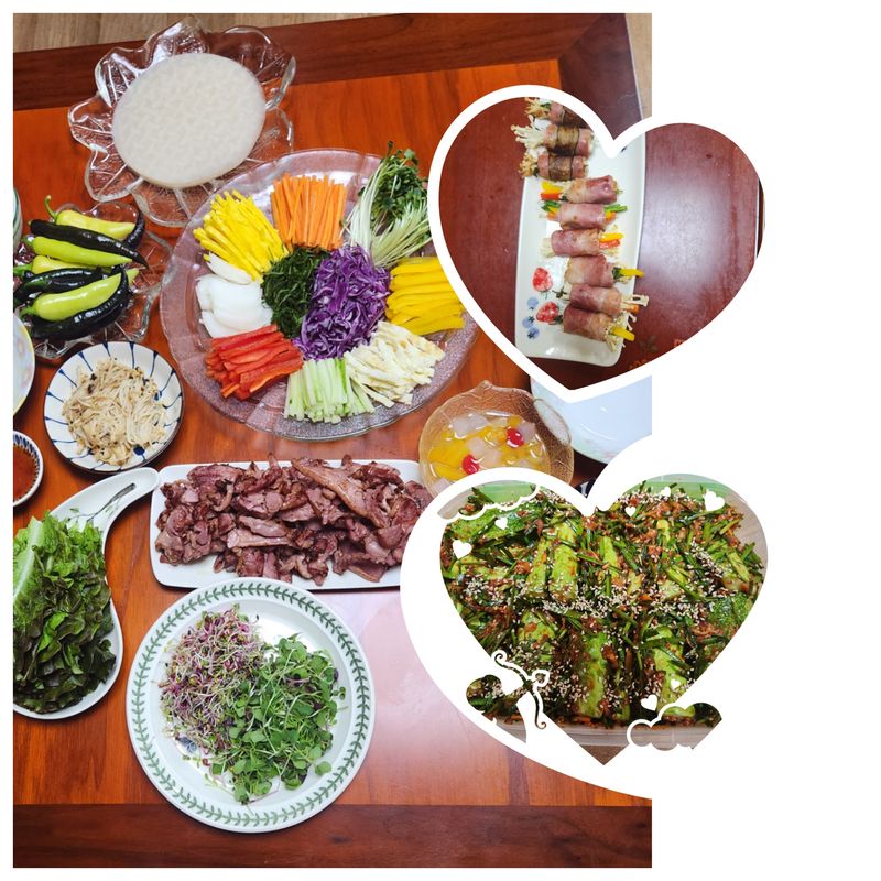 베이컨 말이에 월남쌈까지 다양한 요리가 가득하네요.