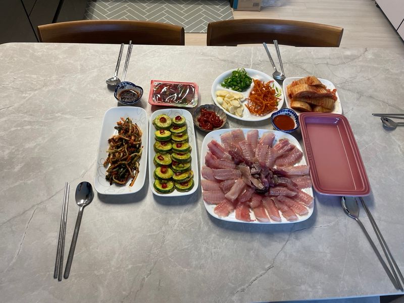 아버지 생신이라서 아버지가 좋아하시는 홍어회를 메인으로 하여 애호박전, 파김치 수육을 하고 미역국도 끓였습니다~~~ 수육이랑미역국을 담기전에 찍어서 사진엔 없지만 너무 맛있었습니다.