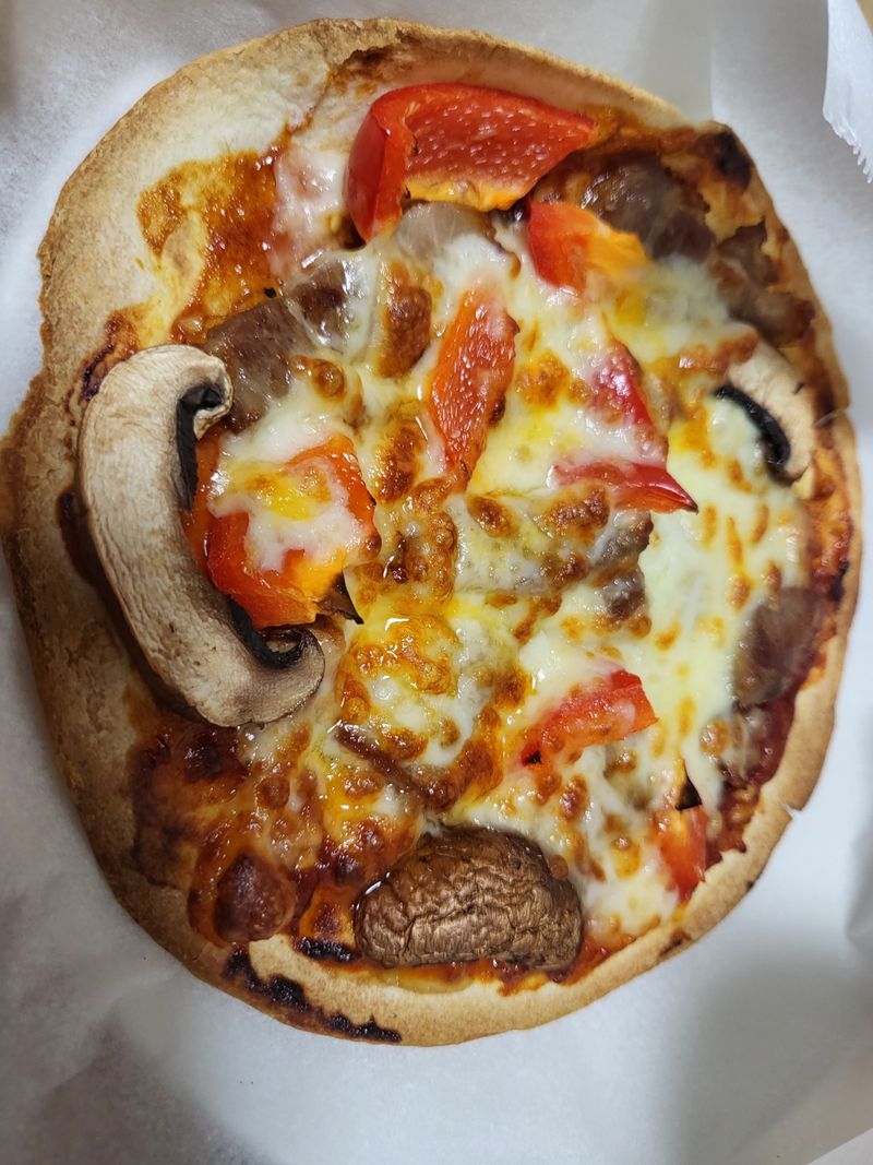 티아시아 버터 난 한 장에 뽀모도로 파스타소스 바르고 파프리카 버섯 등 채소를 올리고 피자치즈만 뿌려 에프에 구우면 완성. 정말 금방 뚝딱 완성되니 좋아요~