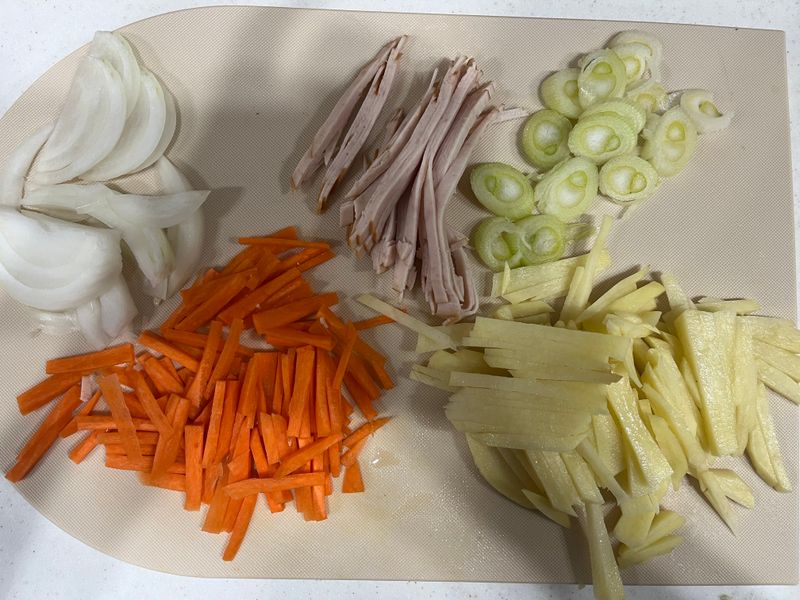 감자랑 당근으로 할 수 있는 요리를 생각하다가 당근감자전을 만들어봤어요~ 당근이랑 감자, 양파는 채썰고, 냉장고에있는 닭가슴살에 부침가루랑 달걀흰자를 넣어서 부치기!
