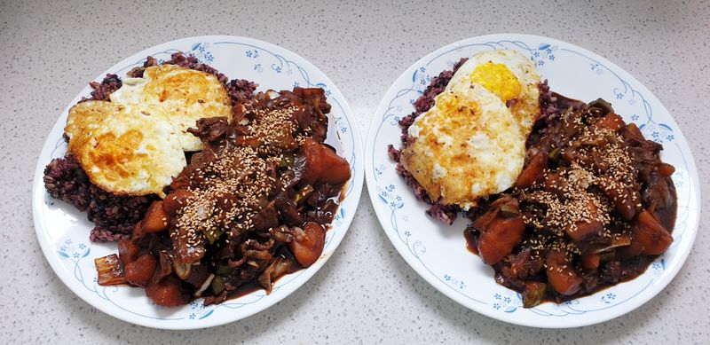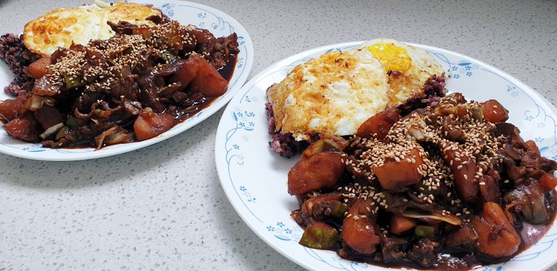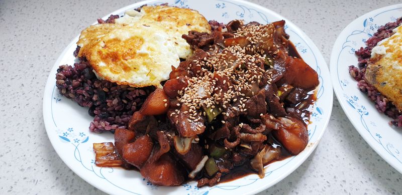우리집에선 직접 춘장을 사서 달달볶고, 양배추랑 양파가득넣고 온갖 채소들 듬뿍듬뿍(집이니까?^^) 어느새 골고루 볶은것들을 합쳐서 살짝 볶아만주고 계란후라이 차르르 올려주면 진짜로 사먹는것보다 든든하고 푸짐한 짜장밥완성!!~~~♡