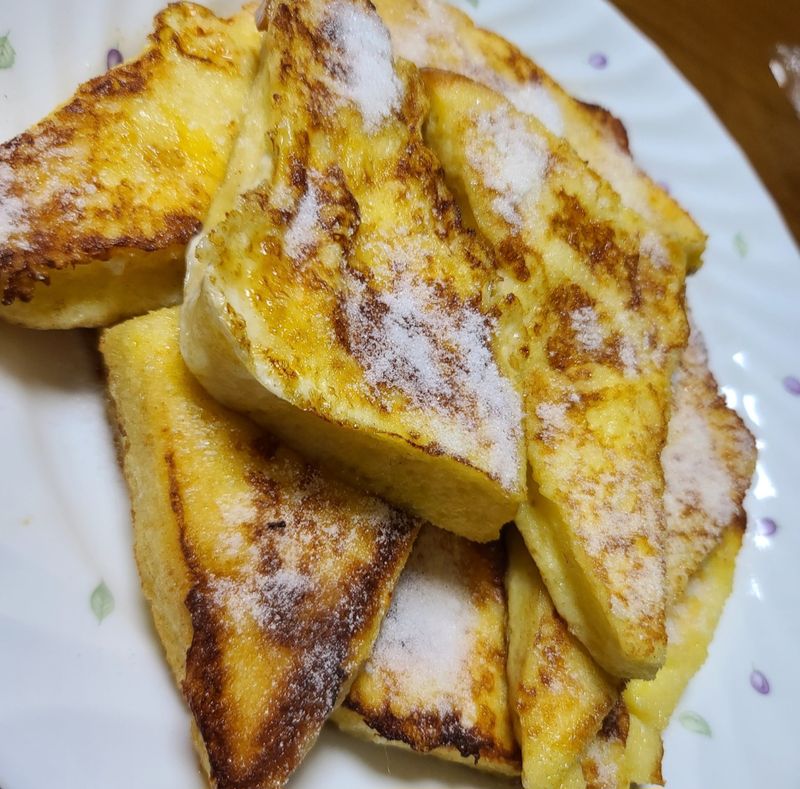 옛날 토스트는 설탕이쟈나요 부드러움을 위해 식빵끄트머리는 크루통을 하고요 식빵을 달걀물(우유+계란+소금약간+설탕조금)해서 버터에 굽고 설탕을 발라서 맛있게 냠냠. 계속 찾게되는 맛이 분명하네요😋