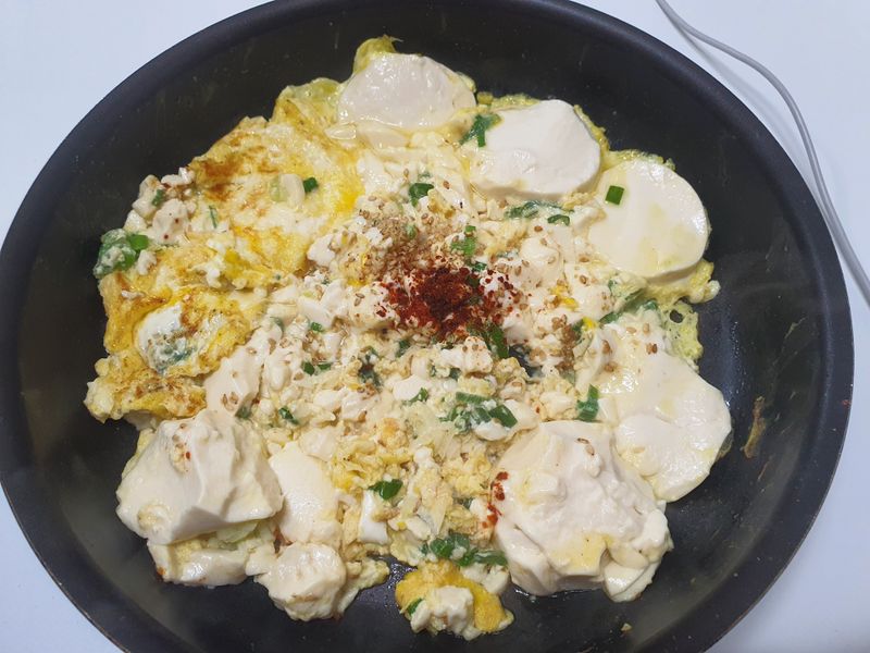 밥하기 귀찮은 아침, 배고픈데 딱히 반찬 이것저것 꺼내먹기 귀찮은 날! -순두부 숭덩숭덩 숟가락으로 잘라서 프라이팬에 둥글게 깔고 -남은 순두부는 가운데에 싹싹 긁어모아 올리고 -지글지글 수분이 날아갈때쯤 한번 뒤집어주고 -연두+후추+소금+쪽파로 간 한 계란물 휘릭 붇고 조금 기다리면 끝!! -참기름 통깨 고춧가루 뿌려서 완성 간단하고 맛있고 든든한 아침🌞