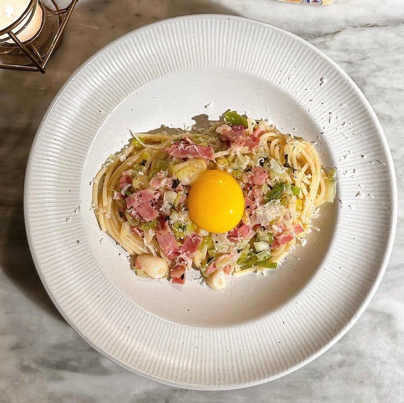 4. 그릇에 담은 파스타에 스모크 올리브 오일, 후추, 파르미지아노 레지아노 치즈를 뿌린 뒤 계란 노른자 올리면 끝.