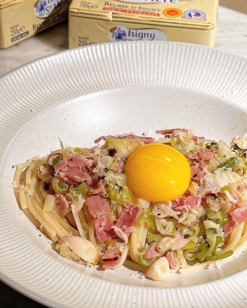 계란 노른자를 터트려 면에 비벼먹으면 너무나 고소하고 부드러운 대파베이컨 파스타 완성💛