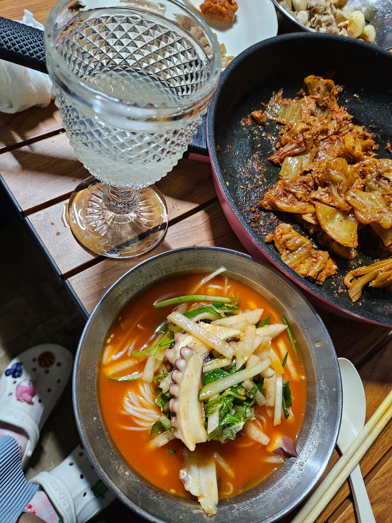 오늘은캠핑장에서좋은사람들과 맛난음식도해먹고 좋은사진은아니지만 닭통집에여러야채넣고 간단한소스로 맛나게했어용ㅎ집에있는모든재료를듬북넣고 진짜맛나게먹었어용~그리고특별식 신랑이잡은문어로 문어물회도해먹었어요ᆞ문어에 새콤달콤 소스국물에 배ᆞ양파ᆞ오이ᆞ당근ᆞ꺂잎ᆞ등등여러가지조합해서맛나게먹었어요ᆞ여러분들도한번도전해보셔요ᆞ샘표간장도꼭용^^
