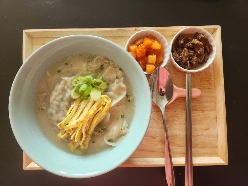 아이와 만든 손만두로 끓인 따끈한 만둣국과 장조림
