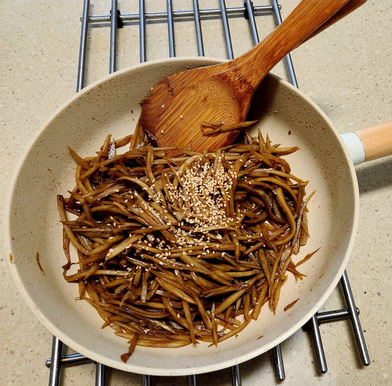 가을에는 꼭 해먹는 가을제철 식재료 우엉이에요!! 가을면연력 밥상에 딱인 우엉조림 쉽게 만들어봤어요♡ 우엉을 썰어 식초물에 30분 담가준다. 기름 두른 윅에 살짝 볶아준다. 만능소스 새미네부엌장조림양념 소스로 간을 한다. 달달볶으면서 조려준다. 물엿으로 한번 휘리릭!! 가을 밑반찬으로 쵝오💜