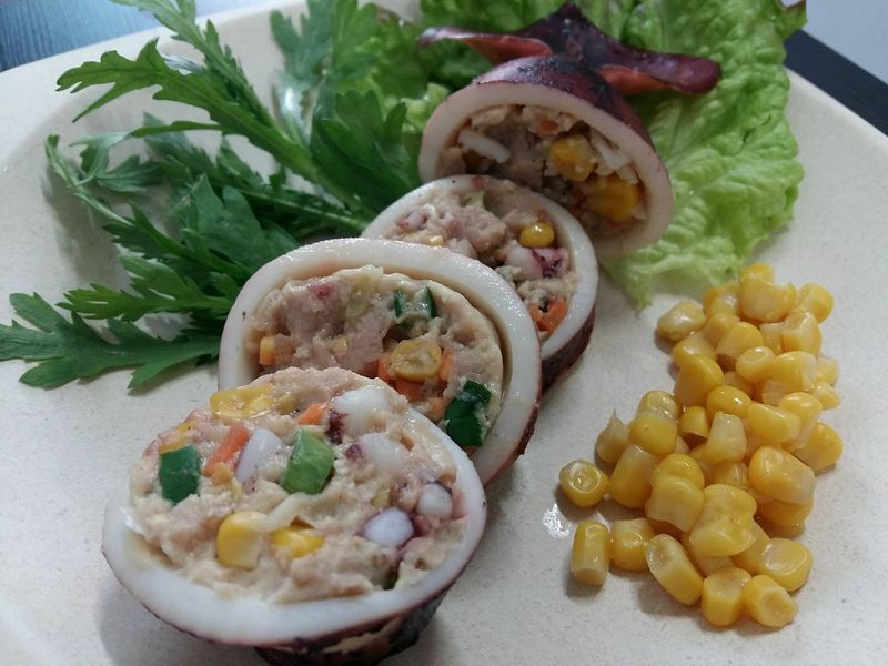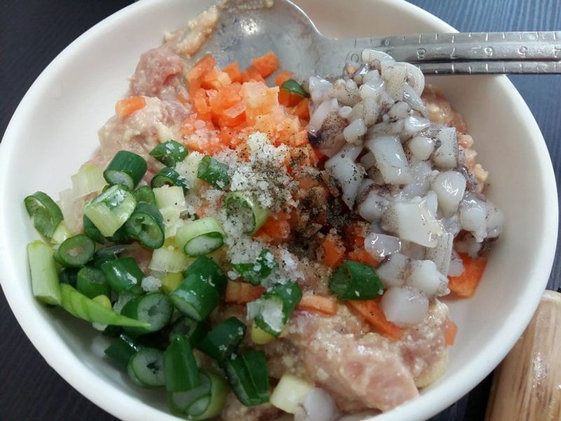 오징어 몸통은 그대로 , 다리는 잘게 다져서 두부, 파,당근,다진고기,마늘조물조물 양념을 만들고