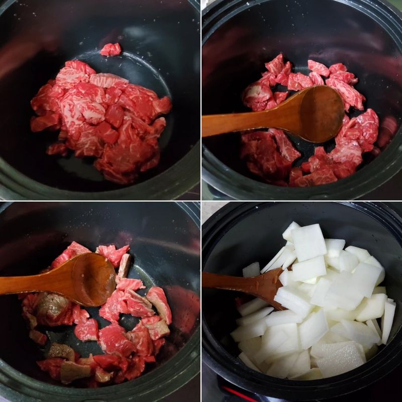 소고기국거리용을 참기름을 넣고 팬에 볶아주세요.