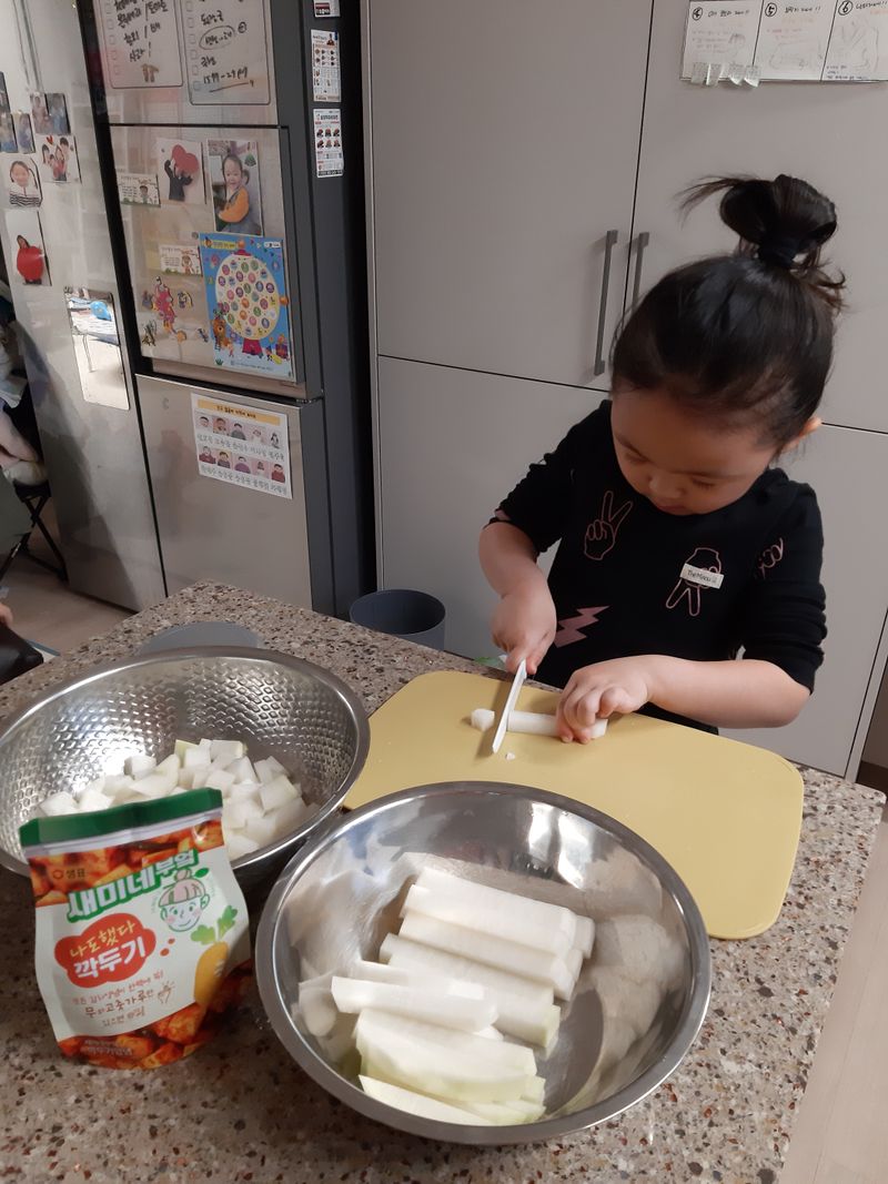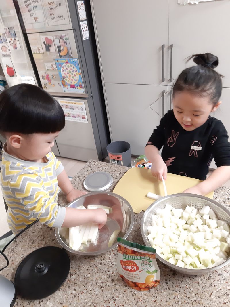 깍두기가 좋아진 남매♡ 서툴지만 케이크 플라스틱 칼로 무우를 잘라 맛있는 깍두기 완성♡♡ 새미네부엌덕분에 더욱 맛난 깍두기 완성!!