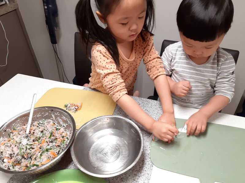 남매가 열심히 짜조를 만들어보았어요 처음이라 쉽지 않았지만 열심히 만들어 맛있게 잘먹었답니당ㅋ