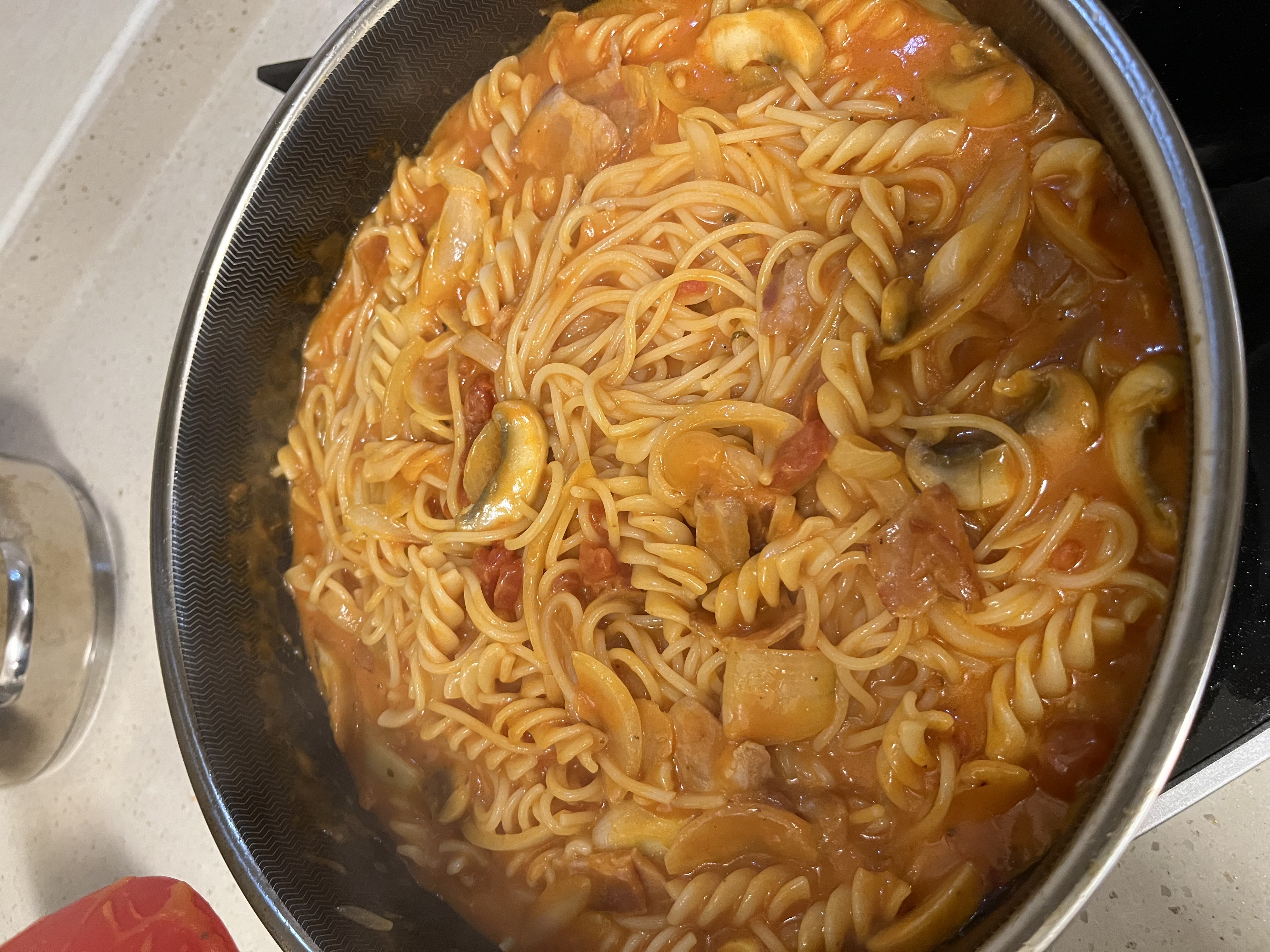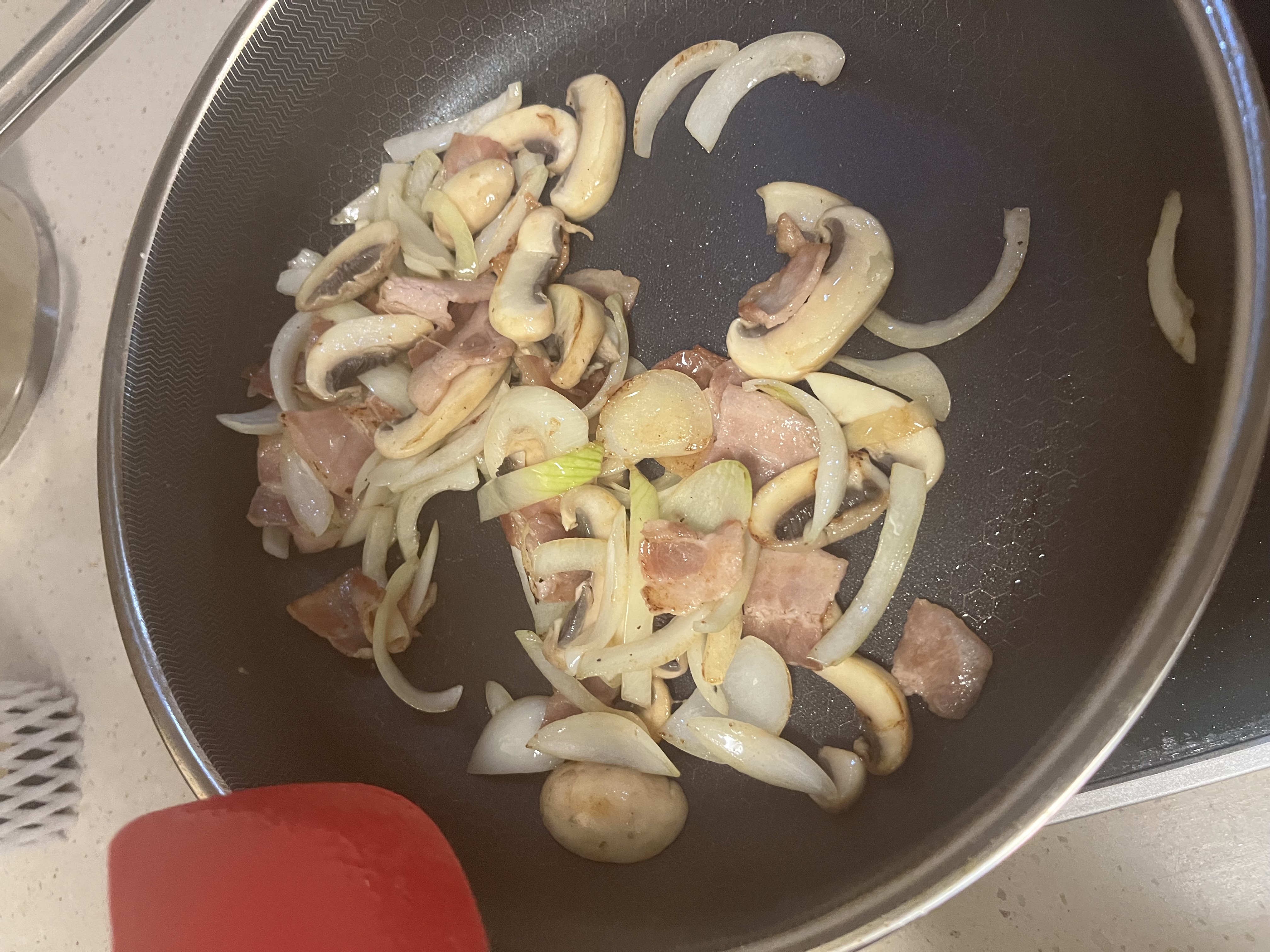 파스타면 삶기, 야채(양송이버섯+양파+베이컨) 볶고, 로제크림소스와 우유넣고 잘 볶아줍니다. 파스타면과 골고루 섞으면 맛있고 간단한 저녁식사 완성입니다~~^^