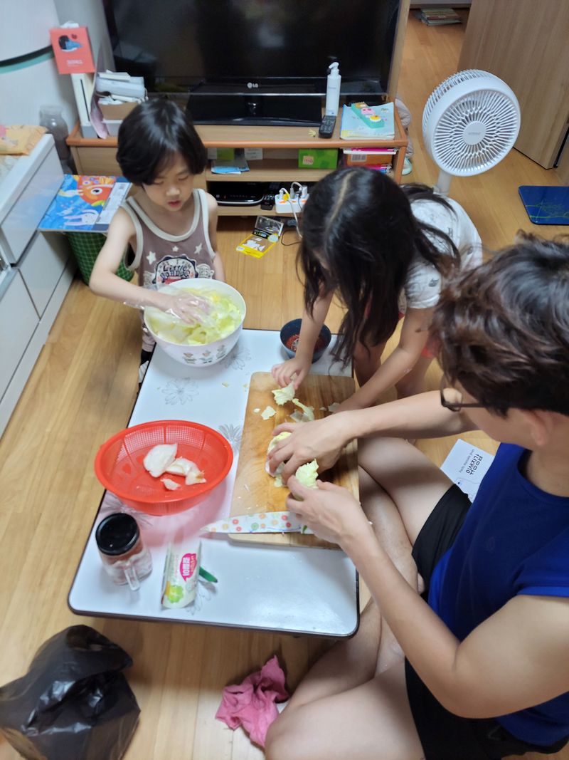 가족들이 옹기종기 모여서 요리하는 모습이 화목해보여요~