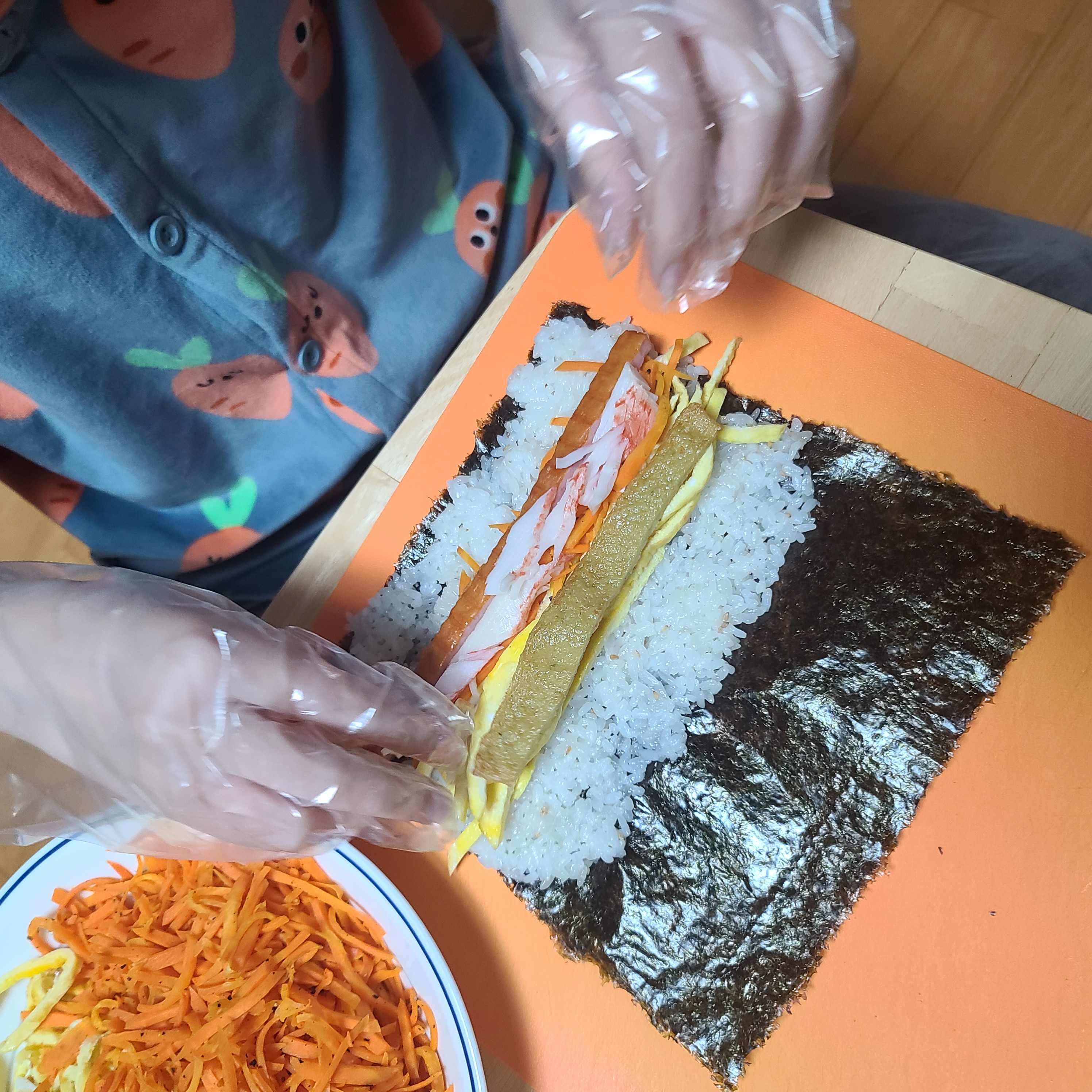 저는 재료를 장만하고 아이들이 김밥 말 수 있게 세팅을